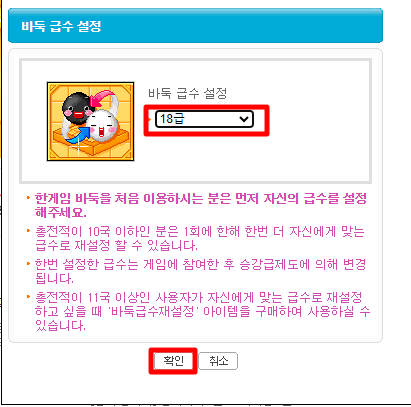 게임을 시작하기전에 설정화면이 나왔습니다.저는 바둑을 해본적이 없기때문에 가장 밑에 단계인 18급으로 선택후 확인버튼을 클릭했습니다.