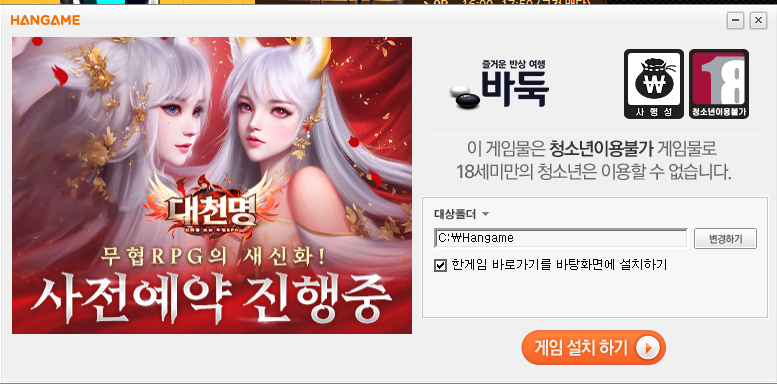 마지막으로 이제 한게임 런처가 나타나게 되는데 게임설치하기 버튼을 눌러서 설치를 시작합니다.