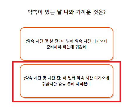 약속이 있는날 나와 가까운것은 인데 저는 시간약속을 중요하게 생각하기 때문에 무조건 아래문항을 선택했습니다.