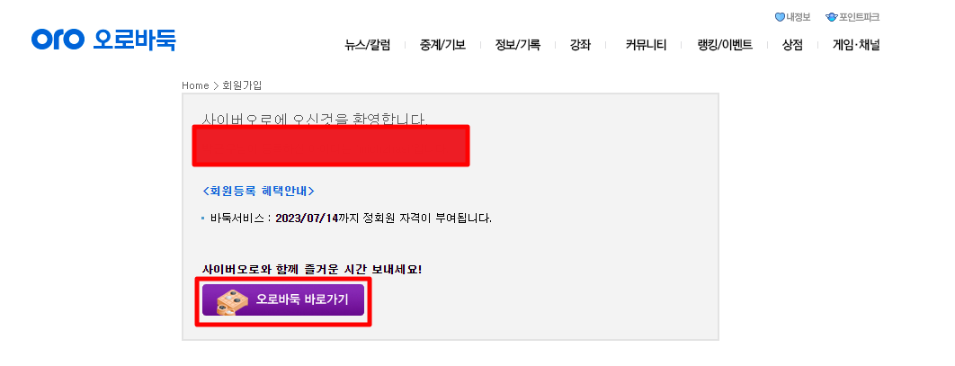 회원가입진행이 완료되었습니다.아이디와 비밀번호를 잊지말고 잘 기억해야합니다.밑에 오로바둑 바로가기 버튼을 클릭하세요
