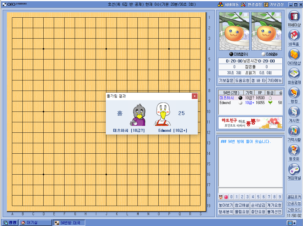 매칭을 시작해서 서로 동의를 하게되면 대국실에 입장하게 됩니다.이제 즐거운 바둑게임을 즐기시기 바랍니다.
