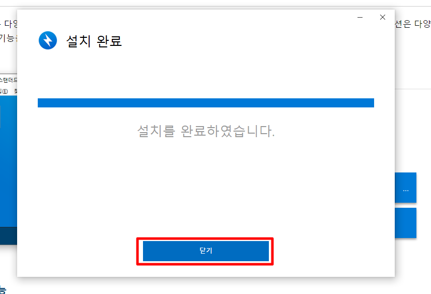 잠시후 설치완료하였다고 안내문구가 나오는데 이제 닫기 버튼을 눌러서 설치작업을 끝내주세요