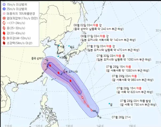 이에 따라 이날 밤이나 9일 밤 규슈 서쪽 해상에 진입할 것으로 보입니다. 최대풍속 35m로 10일 오전 9시 남해안에 상륙할 것으로 보입니다. 당초 태풍은 동해 해안을 따라 북상할 것으로 예보됐습니다. 하지만, 북태평양 고기압이 세력을 확장했고 경로는 서쪽으로 이동했습니다.