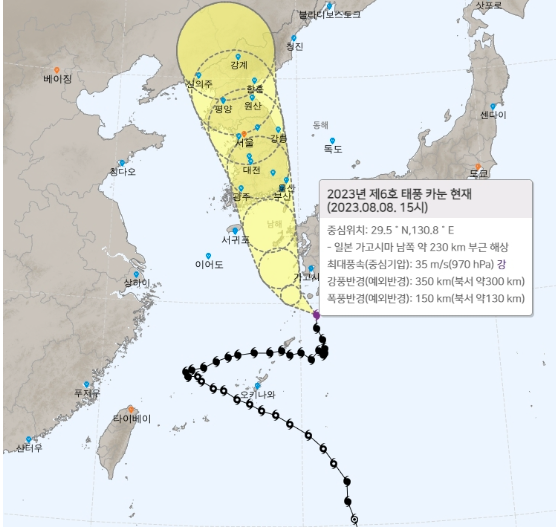 태풍 6호의 예상 이동 경로와 실시간 현재 위치가 화제가 됐습니다. 8일 기상청에 따르면 태풍 카눈은 일본 오키나와 인근 해상에서 잠시 멈췄다가 북상했습니다.하지만 태풍 6호가 이달 10일 한반도에 상륙해 한반도를 관통하는 최악의 경로를 따라 이동할 것이라는 전망이 나왔습니다