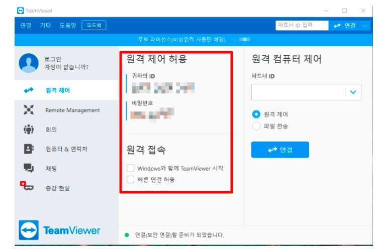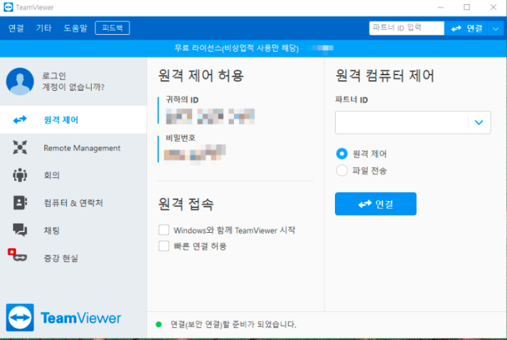 1. 팀뷰어 다운로드 후 아이콘을 클릭하여 실행합니다. 아래 화면에서 가장 먼저 해야 할 일은 아이디와 비밀번호를 확인하는 것이다. 팀 뷰어는 로그인이 필요 없는 프로그램입니다. 따라서 팀 뷰어를 실행할 때마다 ID와 비밀번호가 항상 변경되는 것을 확인할 수 있습니다.