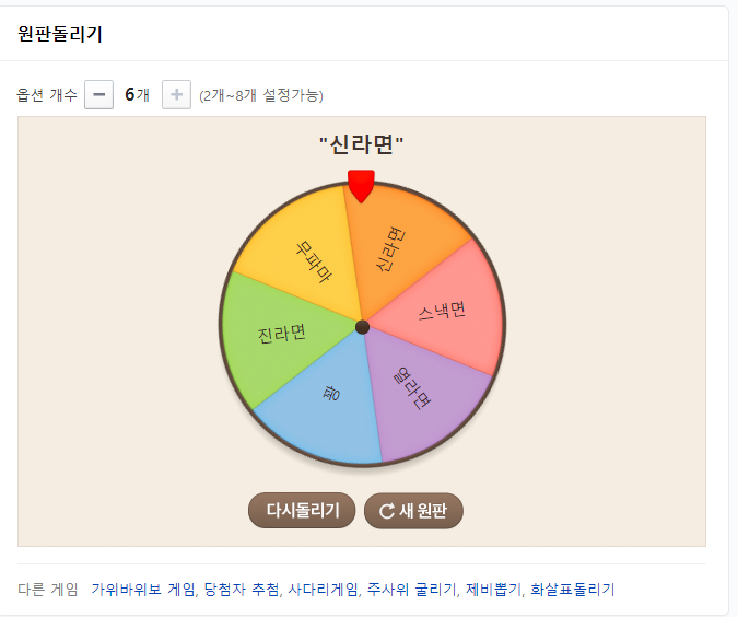 옵션을 구성한 후 마우스로 룰렛판을 터치하면 룰렛판이 회전하여 하나의 결과를 얻을 수 있습니다. 저는 각종 라면을 적어놨습니다.이제 돌려보겠습니다.