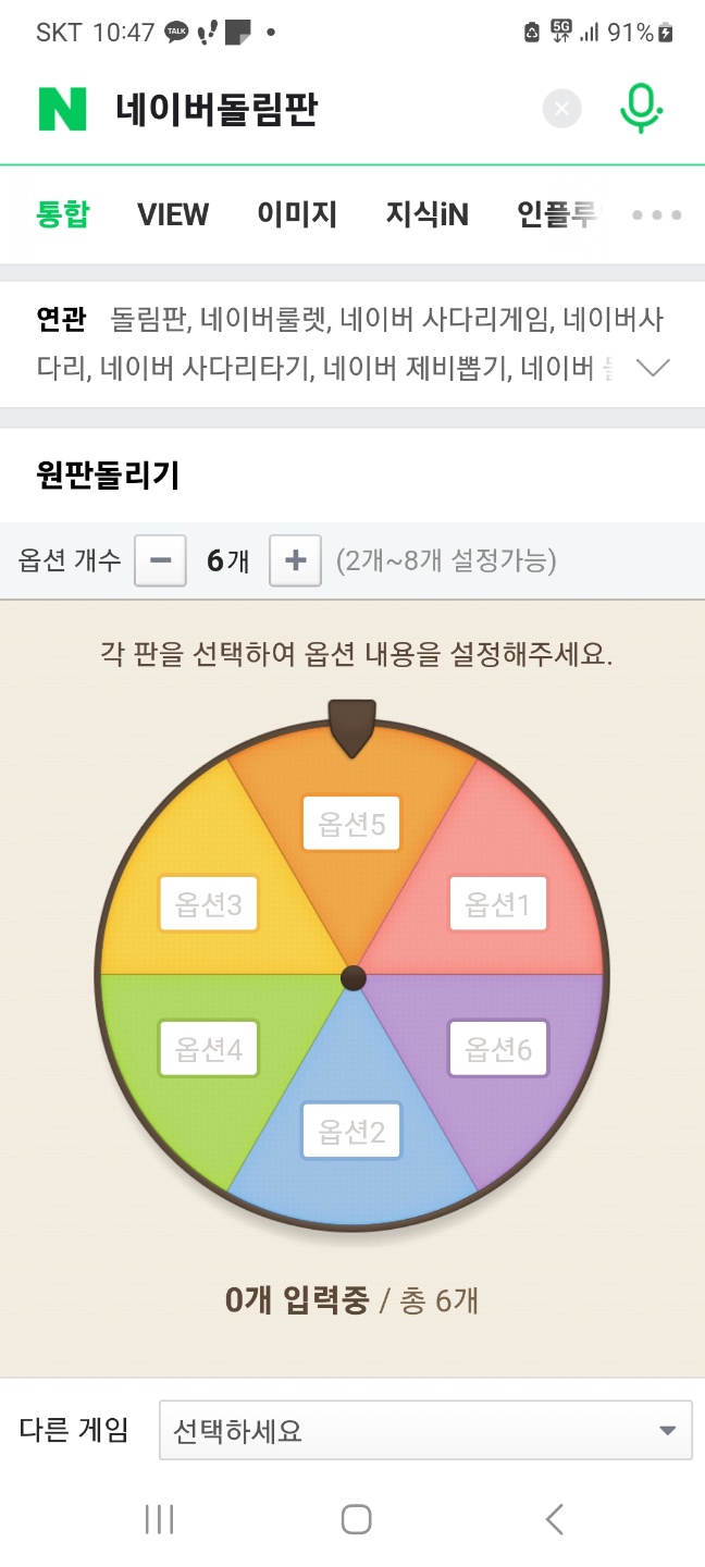 네이버 돌림판게임은 2~8개의 옵션을 설정한 후 디스크를 터치하면 세트 옵션 중 하나를 얻을 수 있는 게임입니다. TV에서 자주 볼 수 있는 룰렛 휠처럼 컴퓨터에서 마우스로 클릭하고 모바일에서 터치하면 회전할 수 있습니다.