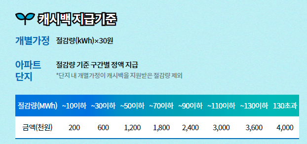 절감액(kWh) x 30원 그것이 아파트의 양입니다 단, 구간별로 감액 금액에 따라 확정 금액을 지급하겠습니다. 단지 내 개별 가구가 캐시백을 받은 저축액을 제외한 것. 이 금액이 최대 지급 금액입니다