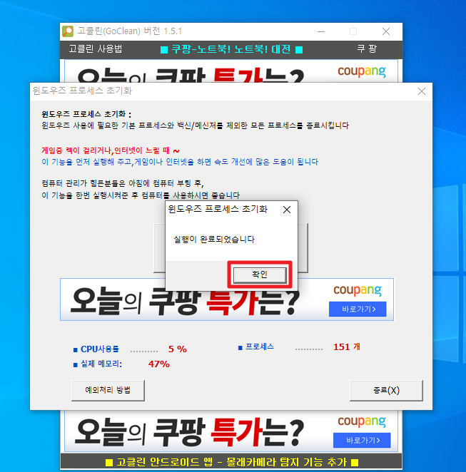 10.실행이 완료되고 확인버튼을 누르면 이제 느렸던 컴퓨터가 빨라지는걸 느끼실수 있습니다.