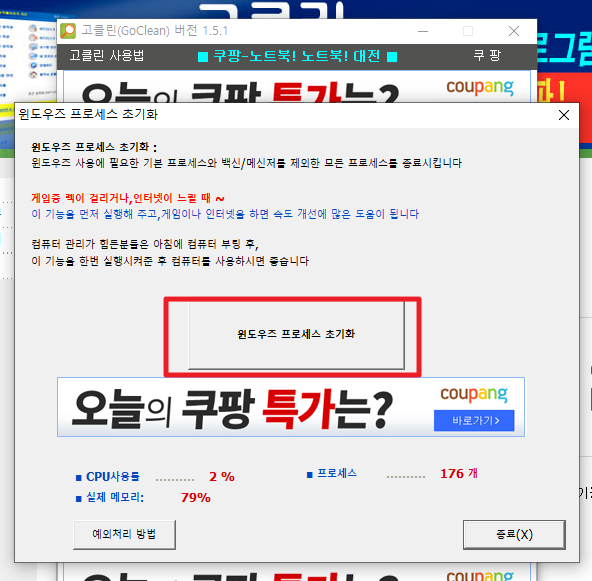 9.윈도우즈 프로세스 초기화 버튼을 클릭합니다.