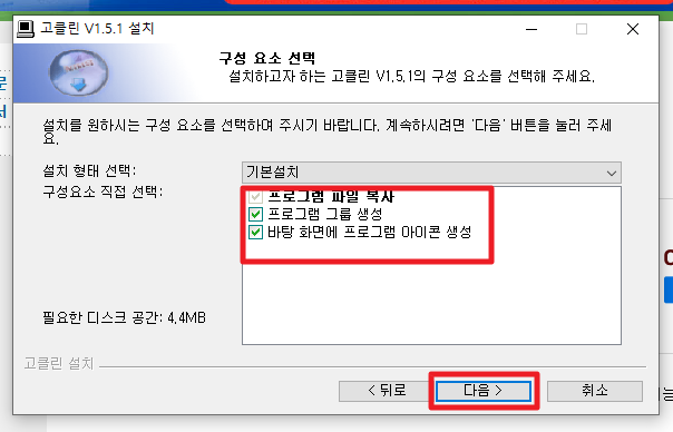 5.구성요소 선택화면이 나타나고 원하는곳에 체크를 해준후 다음버튼을 누릅니다.
