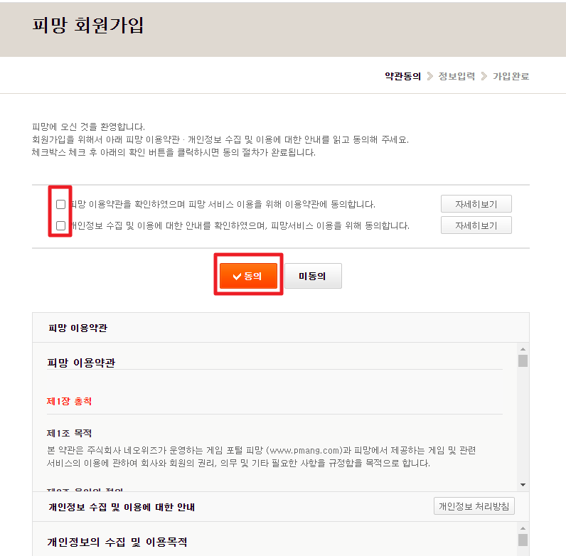 위에 홈페이지로 이동하여 피망에 로그인하시면 됩니다. 아이디와 비밀번호를 입력하시면 접속이 가능하며, 네이버/페이스북/구글 계정으로도 로그인이 가능하며 아이디가 없으신분은 회원가입을 진행합니다.동의버튼을 눌러줍니다.